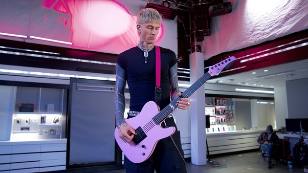 At the end, the narrator says, “We also had a second surprise.” Cut to a curtain falling to reveal mgk rocking a guitar in a nearly empty store.