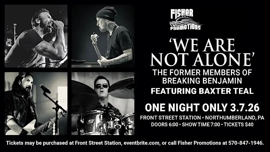 Fuzz 96.1 has your ONLY way in to a COMPLETELY SOLD OUT show! We Are Not Alone — featuring former members of Breaking Benjamin and Baxter Teal — LIVE at Front Street Station in Northumberland March 7th! Doors at 6… Show at 7…And it is 100% SOLD OUT! But Fuzz 96.1 is getting you in! Win your tickets now enter below or with the Fuzz 96.1 App!